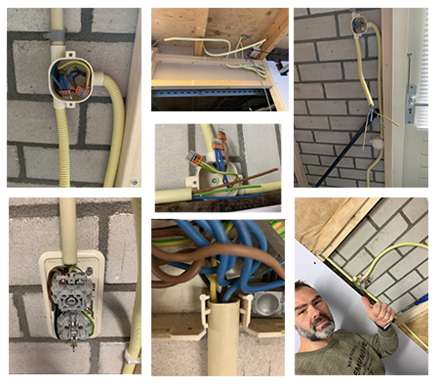 Se ponen los cables (que en holanda son 3) dentro de un tubo. Ese tubo lo puedes ver en las fotos, es como amarillo claro. Una vez hecho eso, se prosigue en rellenar los huecos con todo lo que necesitaba para el “isolatie” que es en español “aislar” o “aislamiento”. Es una especie de tela alcochonada que sirve para que no pase el frío o el calor y que el cuarto esté protegido para el clima frío. Así se pueda instalar el calefactor y que se ahorre energía, por que si no, todo lo caliente del calefactor se sale si no hay este tipo de instalación.