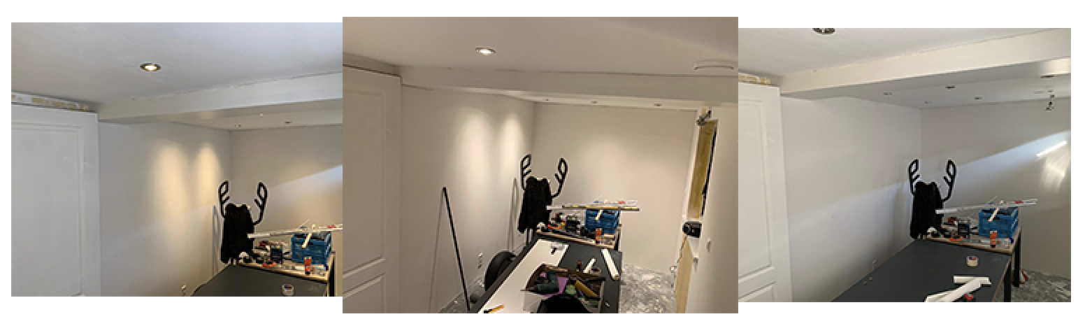 Para las luces del techo, también hizo un diseño de cómo las quería (el). Pensó en lo que yo hacía para trabajar y que la luz no me fuera a lastimar los ojos. También pensó en los videos que grabo y las video conferencias que tengo. Así que puso luces indirectas y unas extra por si necesitaba esa luz extra. Ya antes habíamos hablado de hacer un estudio para mis videos y para sus fotos. ¡Es un genio! quedaron increíbles!