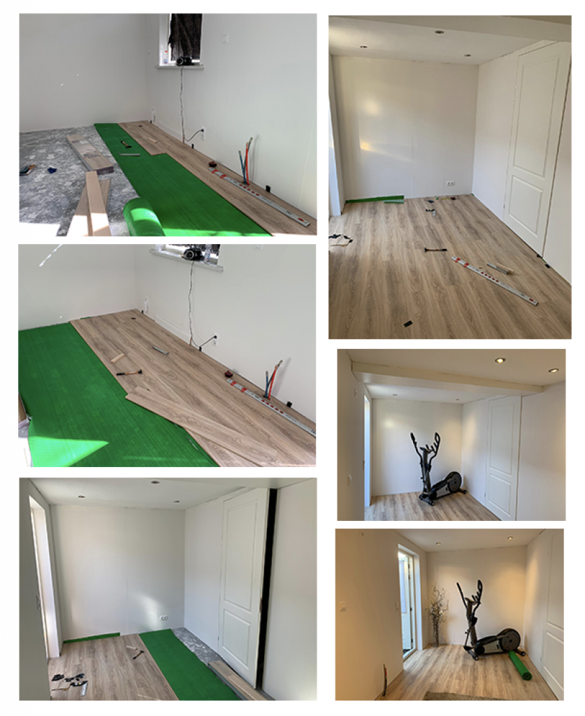 Prosiguió a poner el piso. Eligio un piso laminado color beige (aunque yo le había pedido uno grisaseo). La verdad soy ignorante en el tema de cómo sea en México, pero aquí en Países Bajos tienen un piso laminado que se va atorando una pieza con otra; estilo un rompecabezas. Y se le tiene que poner una especie de alfombra para que amortice y no rechine cuando pisas, además de que funge también como aislamiento para las temperaturas. Si no me equivoco, son como dos capas de esa “especie de alfombra”. Eso es lo verde que ves en las fotos.